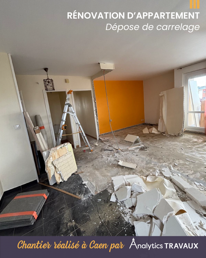 Les travaux ont débuté par la dépose intégrale des éléments existants : carrelage, sols des chambres, ancienne cuisine et placard d’entrée. Cette étape essentielle a permis d’assainir les supports et d’optimiser chaque mètre carré avant la mise en œuvre des nouveaux aménagements.