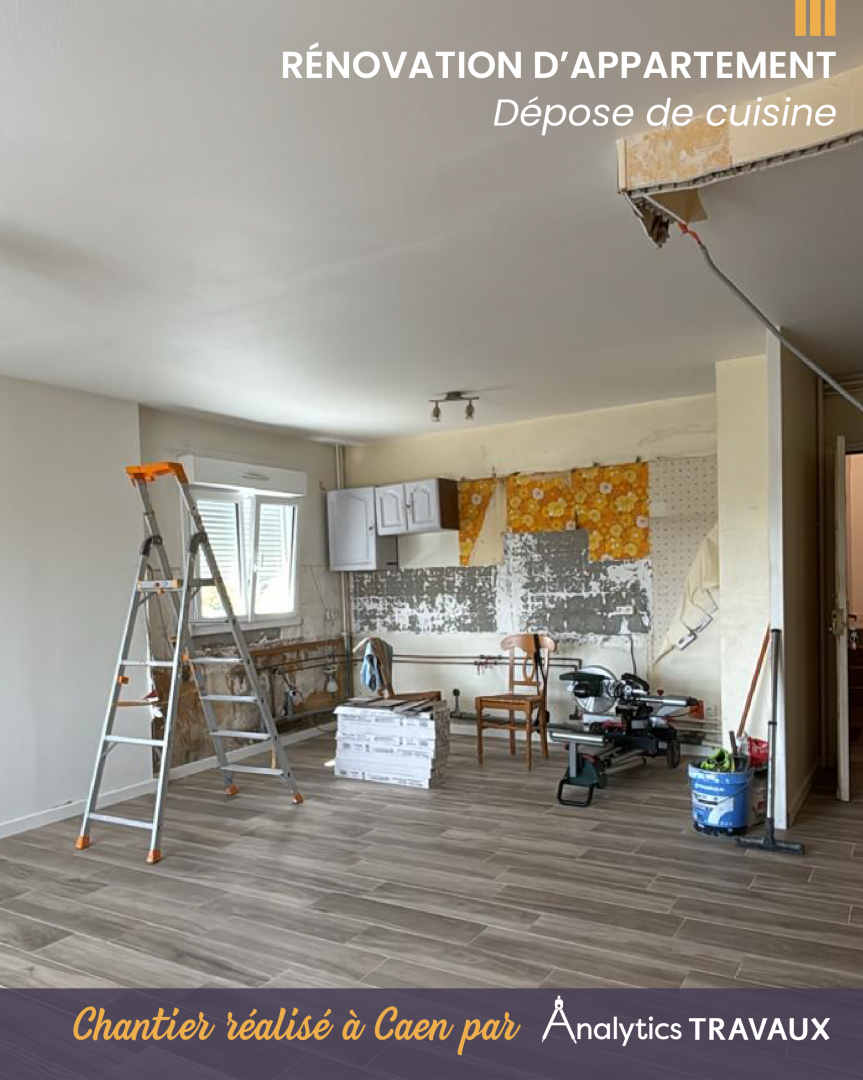 Les photos du chantier illustrent les différentes étapes des travaux, jusqu’au résultat final : un appartement rénové, cohérent et prêt à vivre.